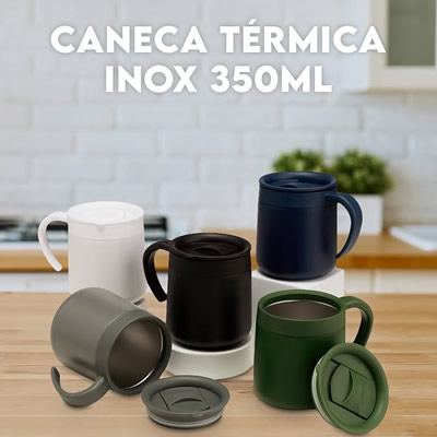 Caneca térmica em aço inox com capacidade 350ml, parede externa com pintura a pó. Parede dupla isolada à vácuo, tampa plástica com anel em silicone para vedação, alça lateral em inox na cor do produto, base em cortiça.Conserva líquidos : ?? 3 horas ?? 4 horas